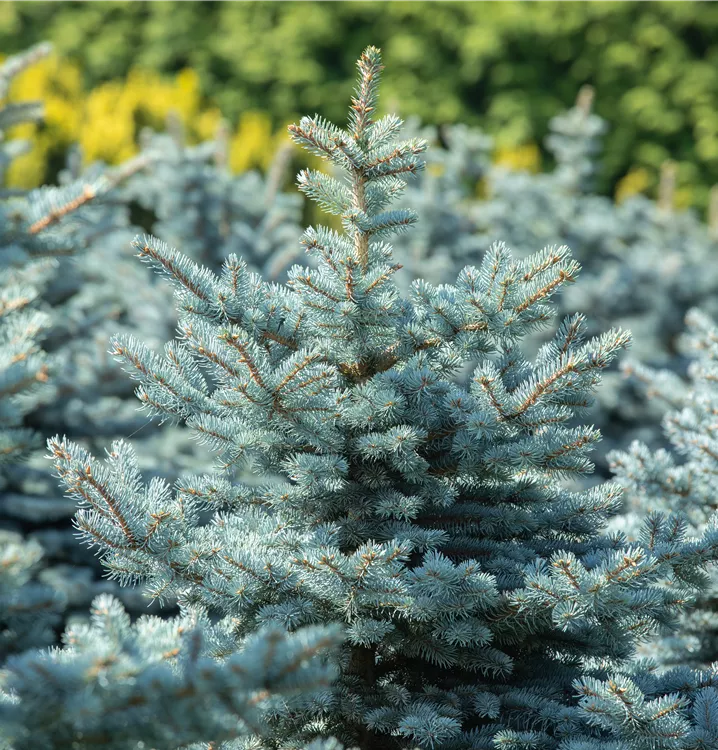 Kleine Blaufichte 'Glauca Globosa' ist ein kugelförmig wachsender Kleinstrauch. Sie erreicht gewöhnlich eine Höhe von 1,5 - 2 m und wird ca. 2 - 3 m breit. Langsam wachsend. In der Regel wächst sie 7 - 8 cm pro Jahr.