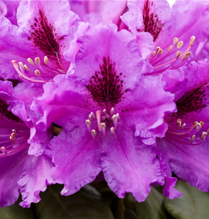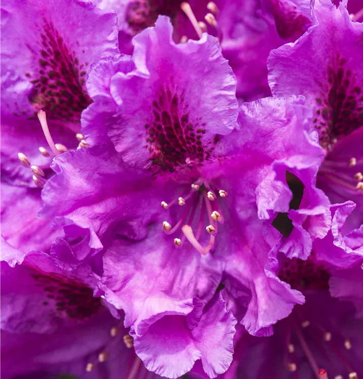 Rhododendron 'Azurro' bringt von Ende Mai bis Mitte Juni violette, schwarze Zeichnung, trichterförmige, in Dolden angeordnete Blüten hervor.