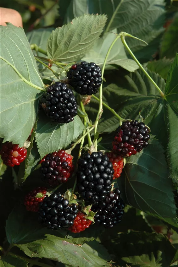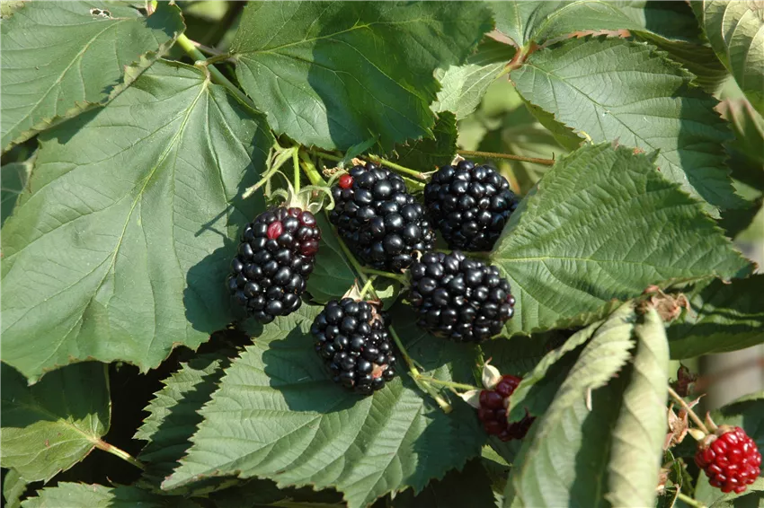 Seitentriebe, an denen im Vorjahr Brombeeren wuchsen, sollten entfernt werden. Denn sie tragen nur einmal, sterben dann ab und machen damit Platz für neue Triebe, an denen dann neue Früchte wachsen. Sind die Früchte vollreif, lassen sie sich leicht vom Strauch lösen, sind gänzlich schwarz und schmecken fruchtig-süß.