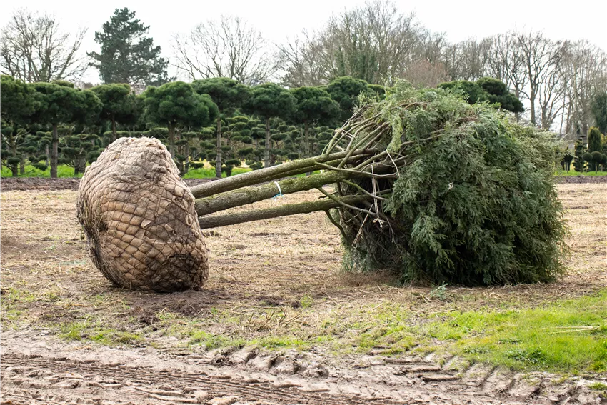 Nadelgehölze sollten idealerweise direkt nach dem Kauf eingepflanzt werden. Lässt sich eine mehrtägige Lagerzeit nicht vermeiden, ist es wichtig, die Pflanzen in den Schatten zu stellen, damit sie vor der prallen Sonne geschützt sind. Der Erdballen muss unbedingt feucht gehalten werden und darf auf keinen Fall richtig austrocknen. Bei Containerpflanzen reicht ein einfaches Feuchthalten nicht, sie müssen bis zur Einpflanzung regelmäßig gegossen werden. Sowohl Ballen- als auch Containerpflanzen müssen sich vor dem Einpflanzen in einem mit Wasser gefüllten Topf vollsaugen dürfen. Sie sollten mindestens so lange im Wasser bleiben dürfen, bis keine Blasen mehr aufsteigen. Das Nadelgehölz wird während des Herausnehmens lediglich am Ballen und nicht am Gehölz gefasst.
