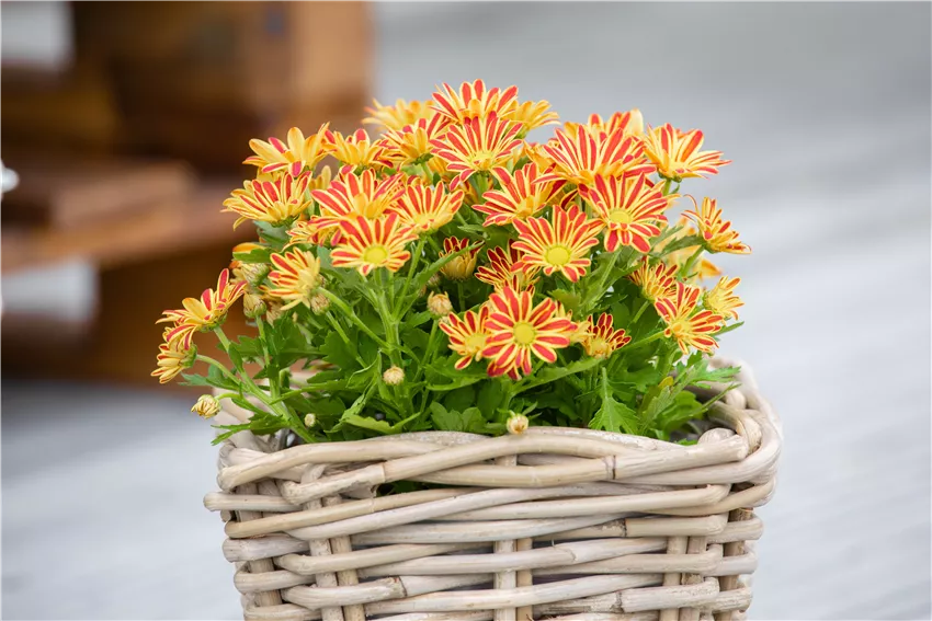 Damit sich die Blühwunder im Garten und auf dem Balkon auch so richtig wohlfühlen können, kommt es auf den richtigen Standort und die optimalen Bedingungen an. Die zu erfüllen ist aber nicht schwer, denn Chrysanthemen sind robust, pflegeleicht und nicht besonders anspruchsvoll. An einem sonnigen Standort fühlen sich die Schönheiten besonders wohl und werden dort viele bunte Blüten ausbilden. Ein nährstoffreicher Boden ist entscheidend für ein gesundes und kräftiges Wachstum. Durchlässig und locker sollte der Boden aber auch sein, denn mit zu feuchter Erde kommen Chrysanthemen nicht gut zurecht. Für eine gute Drainage kann Kies oder Sand in den Gartenboden gemischt werden. Im Kübel ist einfache Blumenerde die beste Wahl. Die enthaltenen Düngeanteile sorgen auch dafür, dass die Pflanzen immer mit ausreichend Nährstoffen versorgt sind. Und wer Verblühtes immer wieder aus der Pflanze putzt, der kann die ohnehin lange Blütezeit noch ein kleines bisschen in die Länge ziehen.
